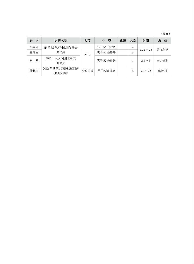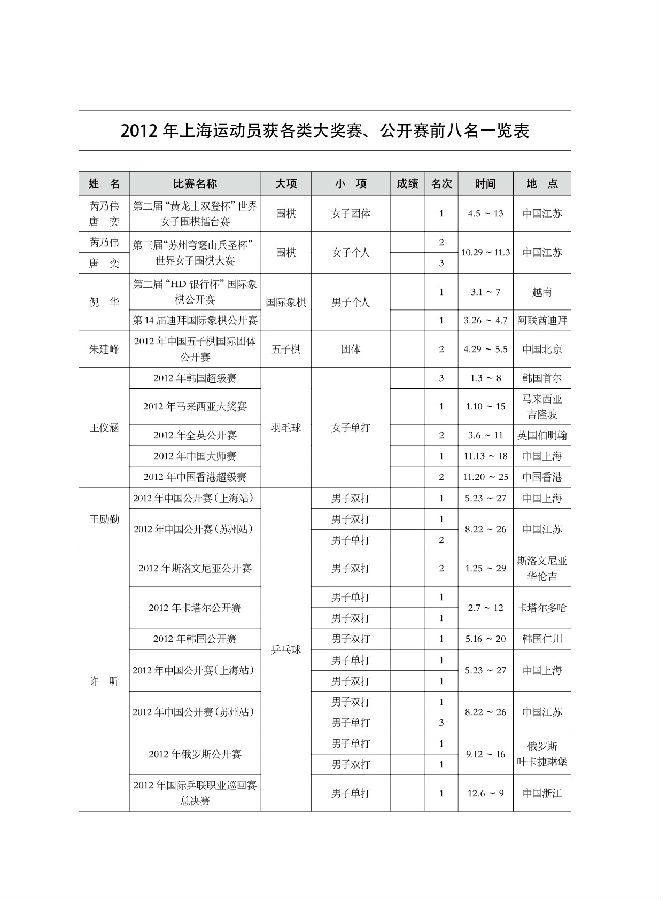 2012年上海运动员获各类大奖赛、公开赛前八名一览表